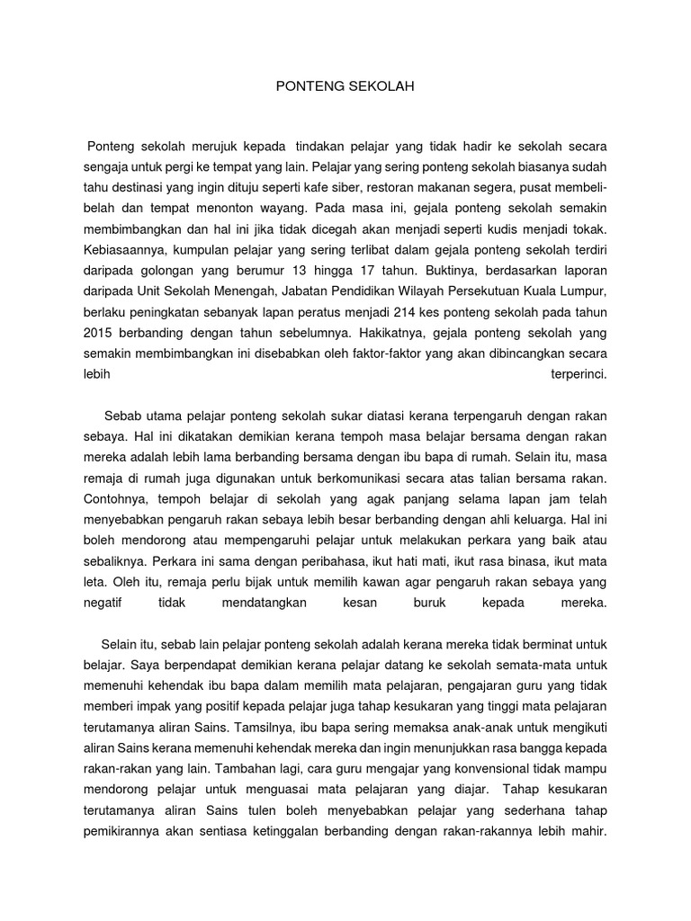 Ponteng sekolah merupakan salah satu permasalahan yang cukup serius di dunia pendidikan Mustaffa Jamil2012. Individu sendiri Kemampuan menguruskan emosi Kemampuan memotivasikan diri Kemampuan mengenali. Ponteng sekolah merupakan satu perbuatan yang menyalahi peraturan sekolah.